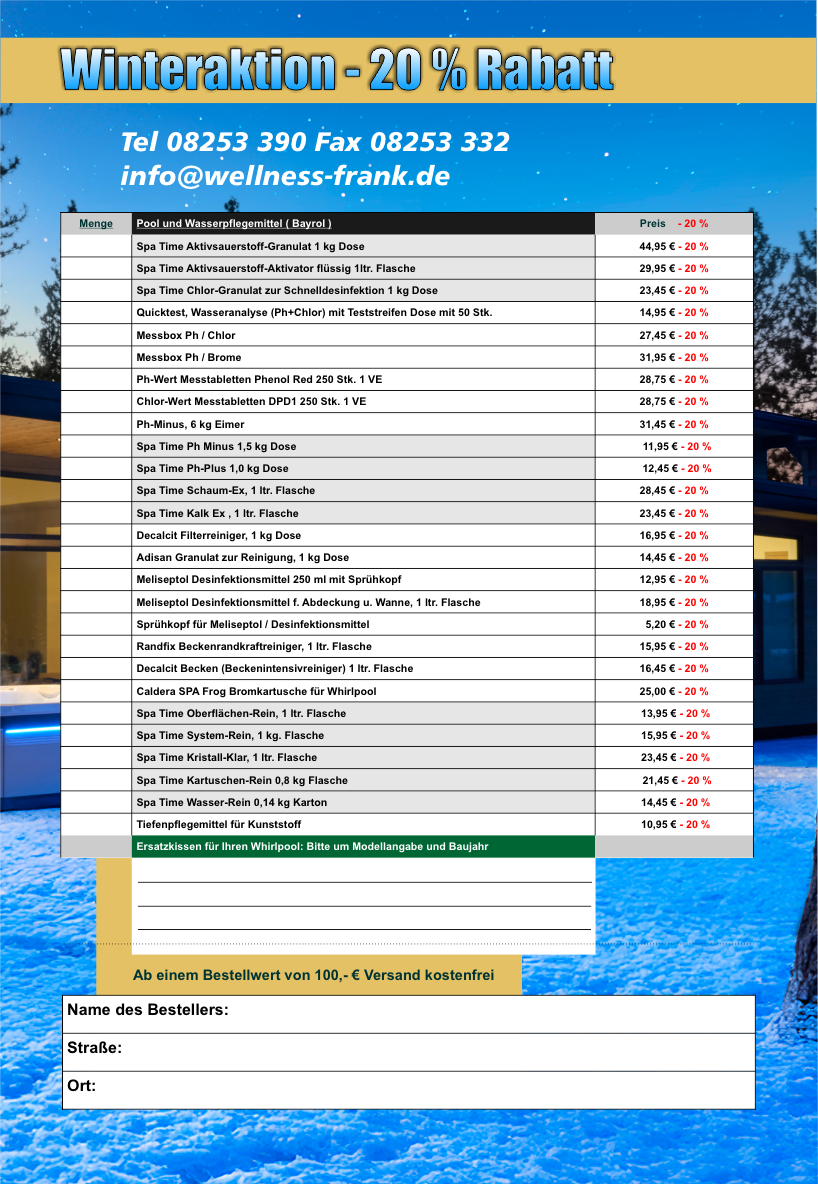 Aktuell ist unser Online Shop aufgrund von Wartungsarbeiten nicht erreichbar bitte kontaktieren Sie uns für Bestellungen telefonisch unter 08253 / 390 oder per Email an info@wellness-frank.de